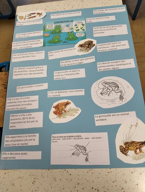 À partir de leurs recherches, les CE1 ont réalisé un panneau explicatif et sont allés présenter leur travail aux autres classes de l’école. Une belle occasion de développer l’expression orale et de partager leurs connaissances. À la fin du projet, les grenouilles ont été relâchées dans leur milieu naturel, dans le respect des animaux.