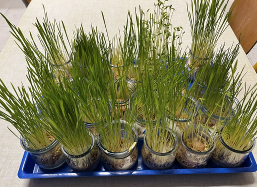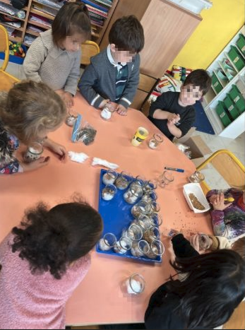 Immersion dans les couleurs : création secondaires à partir des primaires, expérimentations éclaircir/foncer les teintes. Chemin vers Noël avec décoration de la classe et tradition Sainte-Barbe : semis de grains de blé observés chaque jour, signe de prospérité à venir.